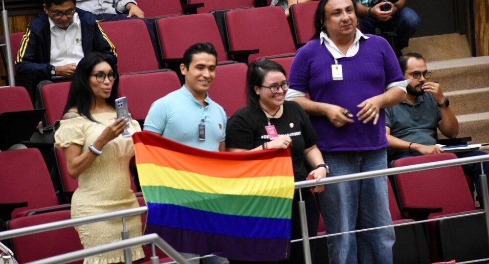Durante la presentación de la iniciativa estuvieron presentes integrantes de la comunidad LGBTQ+ quienes ondearon su bandera de colores.