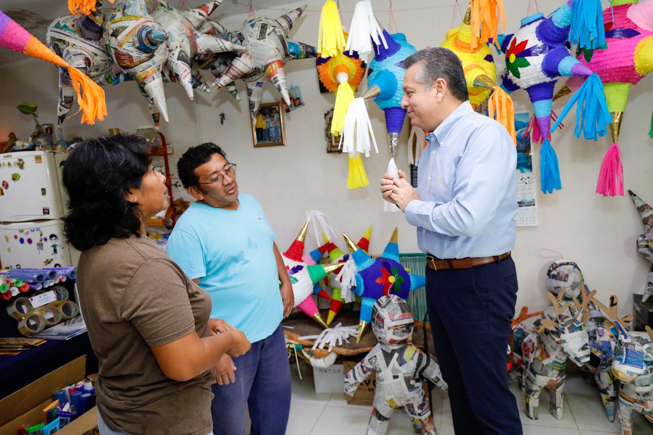 En ese marco, el Presidente Municipal acudió a la colonia Nueva San José Tecoh, donde visitó la casa de la señora Elda del Rosario Canché Puc, quien desde hace 35 años se dedica a la elaboración de piñatas, para entregarle nuevos insumos del programa de apoyos directos para el autoempleo, que le permitirá dinamizar su proyecto económico.